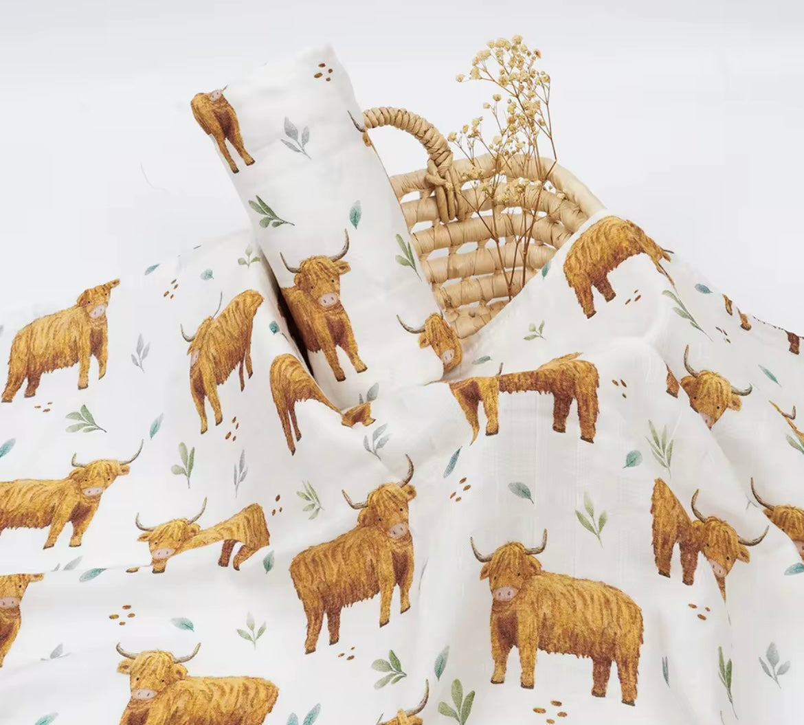 Our Highland Cow Bamboo Cotton swaddle is an essential item for every Bubby.
