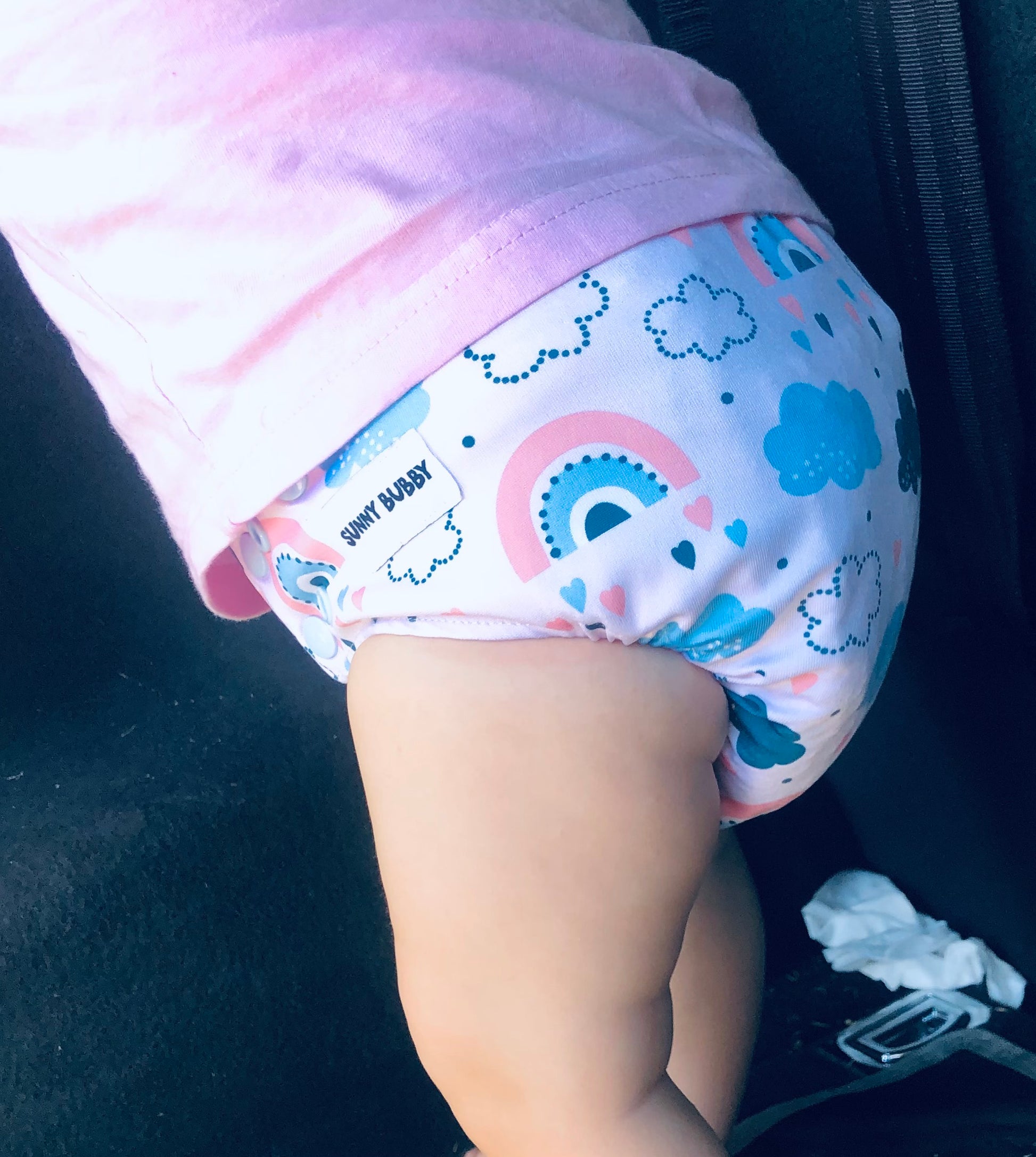 - Back gusset to give a snug fit & stop any unwanted mess and extra washing for bub’s clothes!