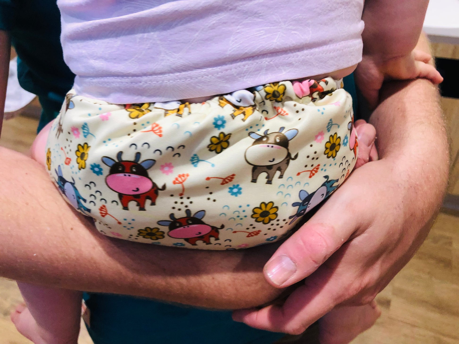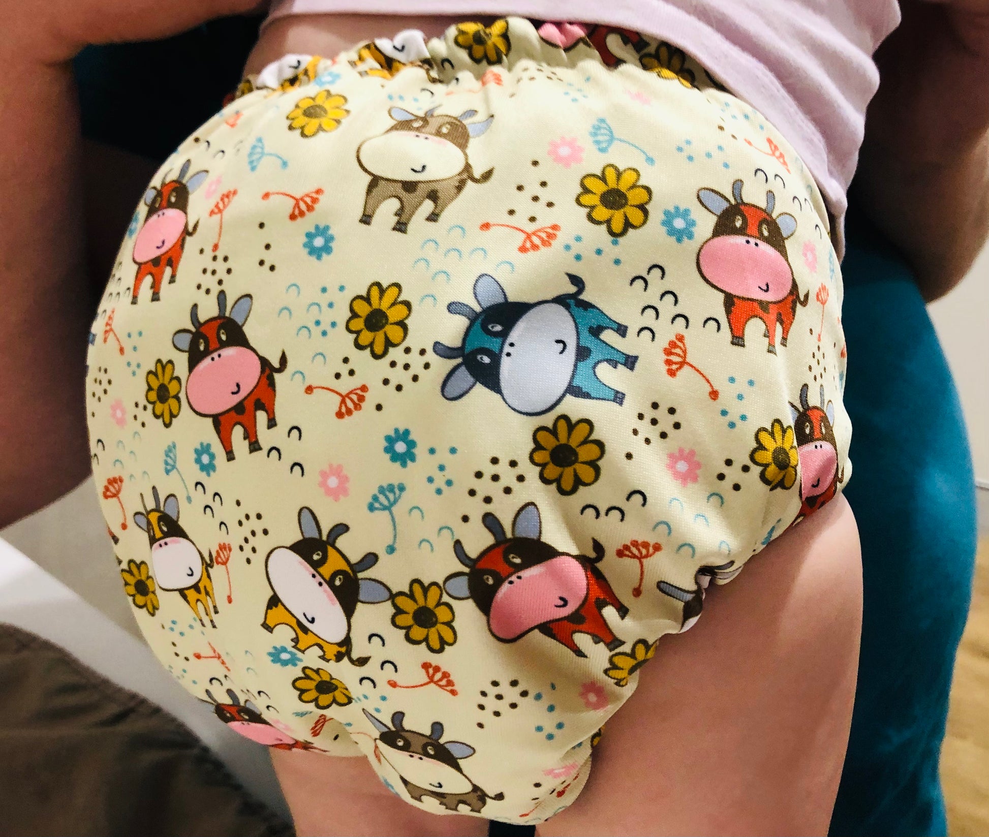 Our Till The Cows Come Home Modern Cloth Pocket Nappy OSFM with Bamboo Cotton French Terry Lining. This is a beautiful stand out print that would suit any bubby.